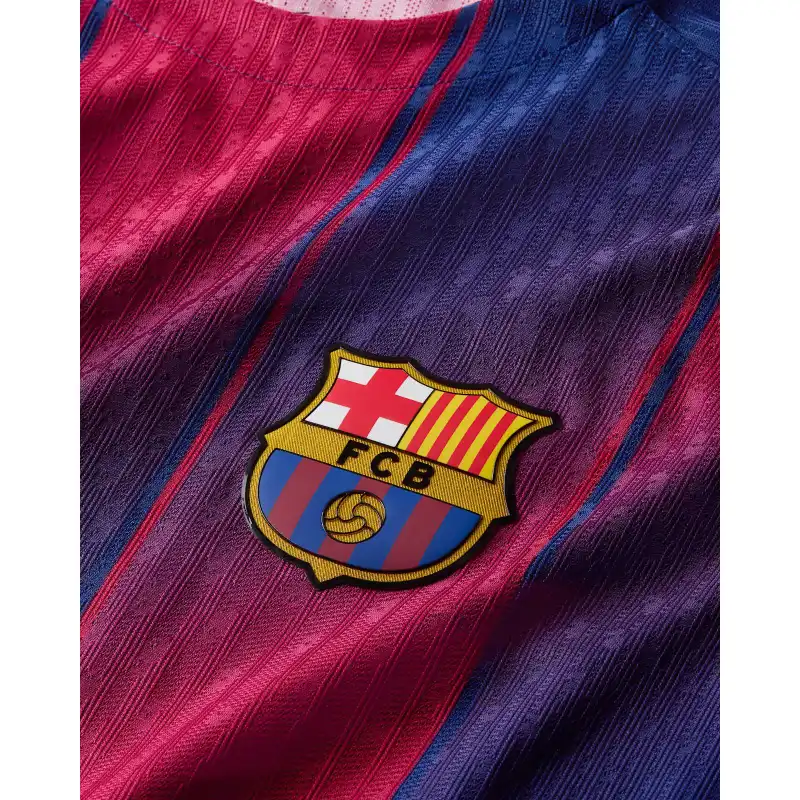 La maglia casa del FC Barcelona per la stagione 2025-2026 rappresenta una perfetta fusione tra la tradizione e il futuro del club catalano. I classici colori rosso e blu si trasformano in strisce verticali sfumate che donano un tocco moderno e dinamico, esaltando l’identità visiva della squadra.